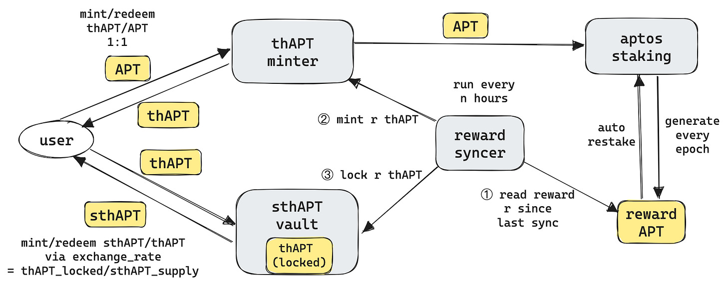 thAPT - Deposit receipt that represents APT on Thala’s validator. thAPT is directly mintable against and redeemable for underlying APT at a 1:1 ratio.