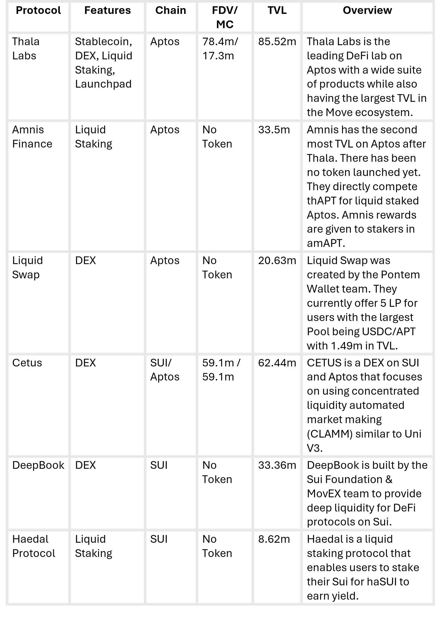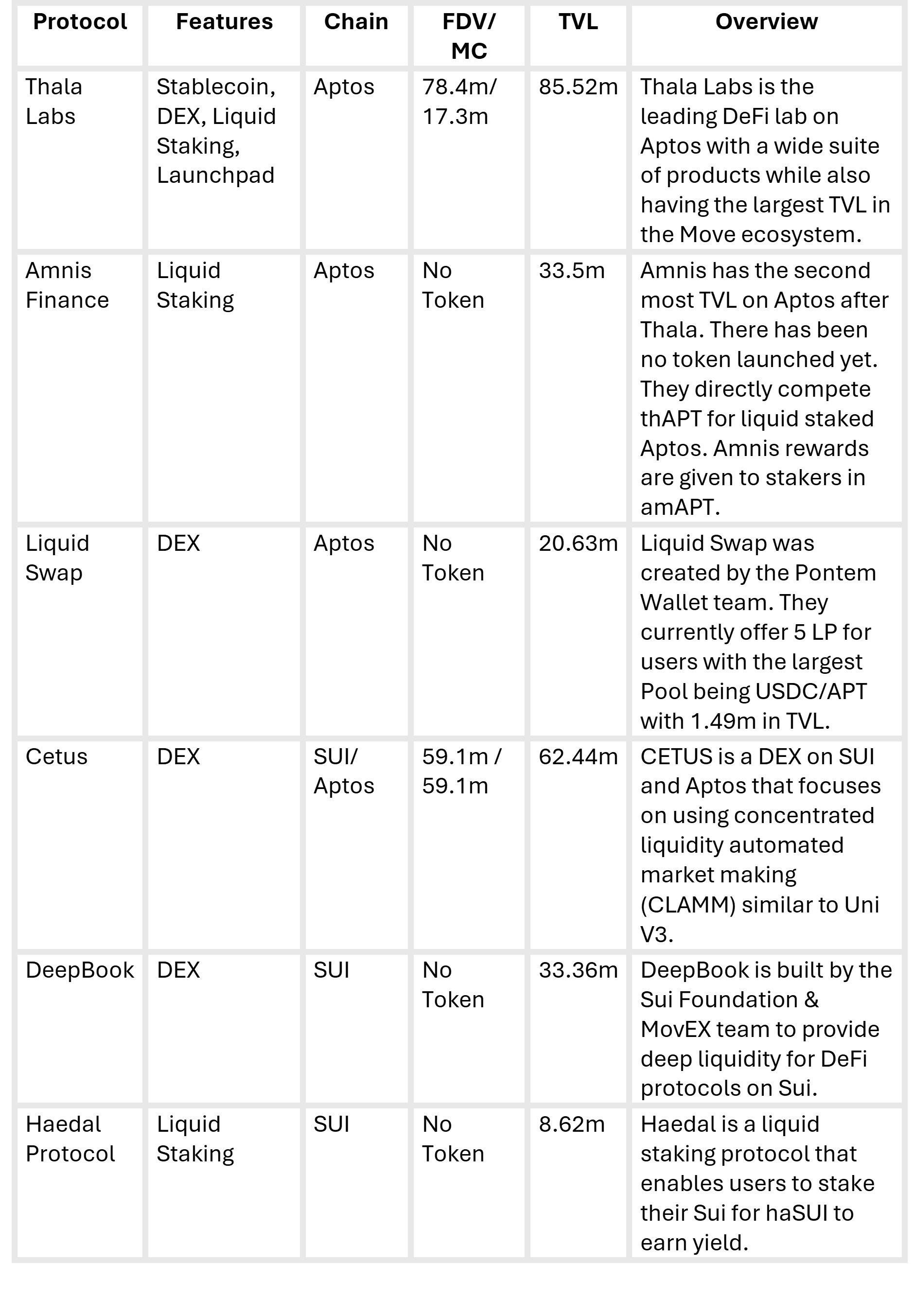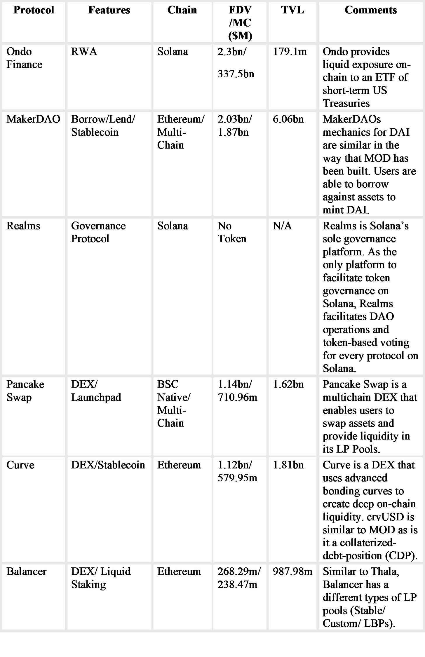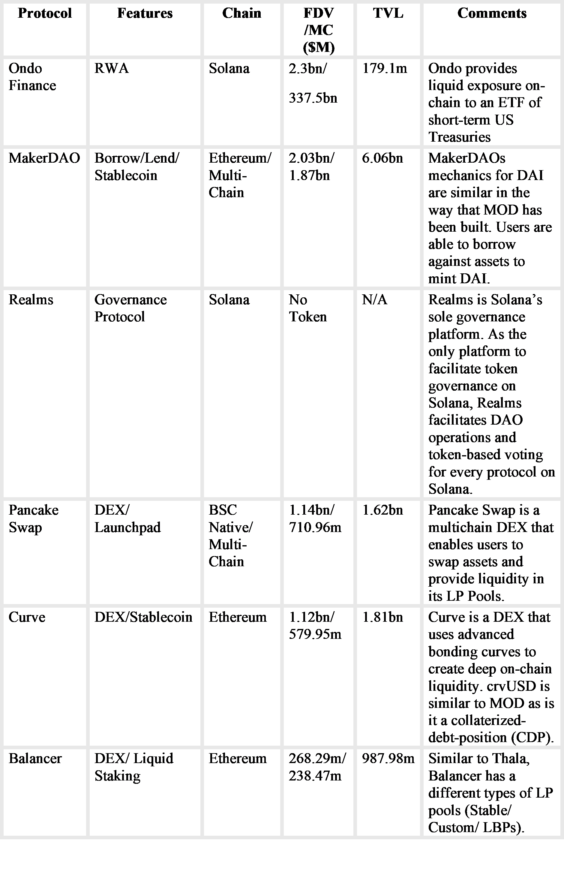 Thala Labs is the leader when it comes to building DeFi primitives on Aptos and any Move-based chain. They boast a TVL of $85.86m which is ~72% of Aptos’s total TVL. The next closest competitor in TVL is Amnis Finance with a TVL of $33.67m. It is hard to benchmark Thala’s valuation to similar products on Aptos and Sui as most of them haven’t released tokens. However, when compared to similar products on other chains, it does seem to reflect that the token is somewhat undervalued as they offer a wider range of products while holding a lot of the TVL on Aptos. In our opinion, a major factor that limits Thala’s growth in valuation is a lower adoption of Aptos and Sui, however, should this change then Thala’s valuation should have a lot of potential to grow.